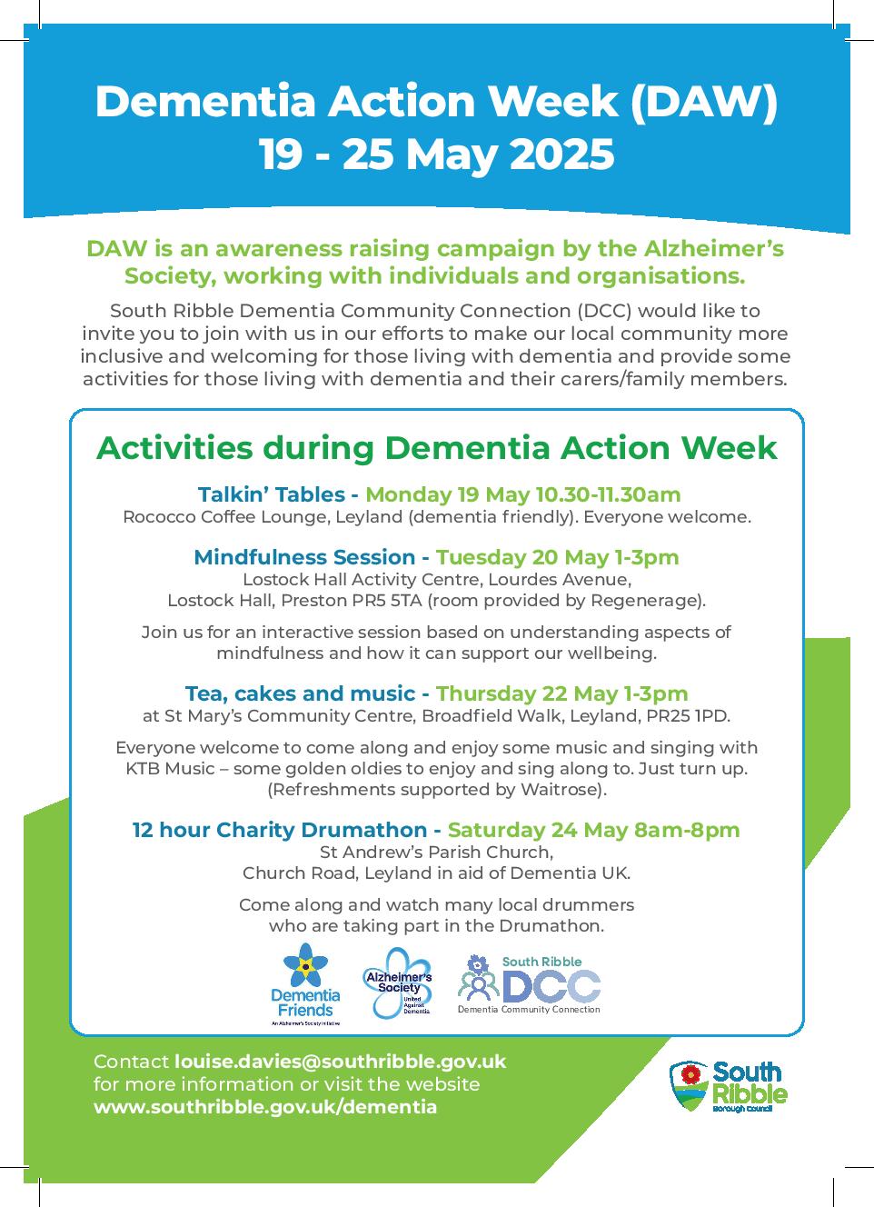 - joining the South Ribble Dementia Community Connection by emailing communities@southribble.gov.uk - in particular if you are a carer or living with dementia, we would value your time to help us develop our plans and activities